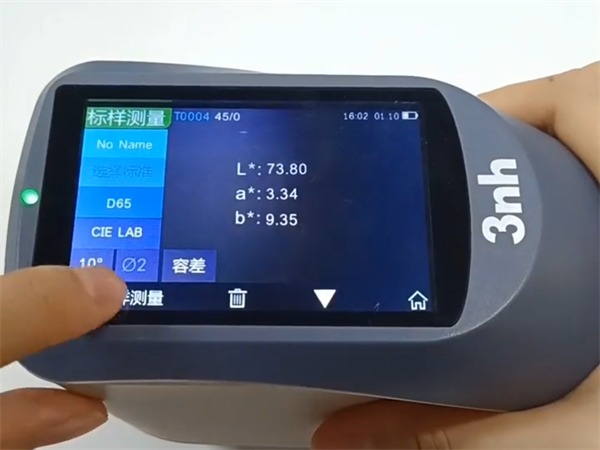 3. 標(biāo)樣測(cè)量。選擇好測(cè)量點(diǎn)和測(cè)量口徑,將YS4510分光測(cè)色儀測(cè)量口貼緊弧面產(chǎn)品,一定要貼緊,避免漏光,影響測(cè)量結(jié)果的準(zhǔn)確性,輕觸測(cè)量鍵進(jìn)行測(cè)量。