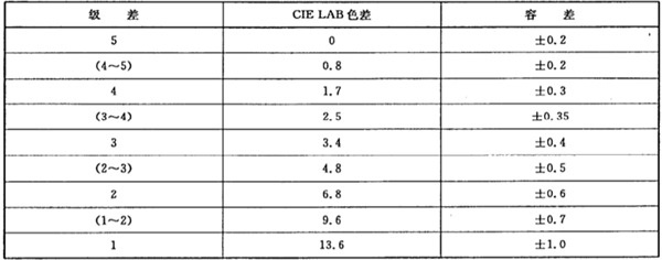 紙片或布片應(yīng)是中性灰色,并應(yīng)是用帶有鏡面反射的分光光度計(jì)測(cè)定,色度數(shù)據(jù)以CIE1964補(bǔ)充標(biāo)準(zhǔn)色度系統(tǒng)(10°視場(chǎng))和D65光源計(jì)算。每對(duì)第一組成的三刺激值Y應(yīng)為士12。每對(duì)第二組成與第一組成色差規(guī)定見下表。括號(hào)內(nèi)數(shù)值僅使用五級(jí)九擋灰卡。1. 評(píng)定變色用灰色樣卡