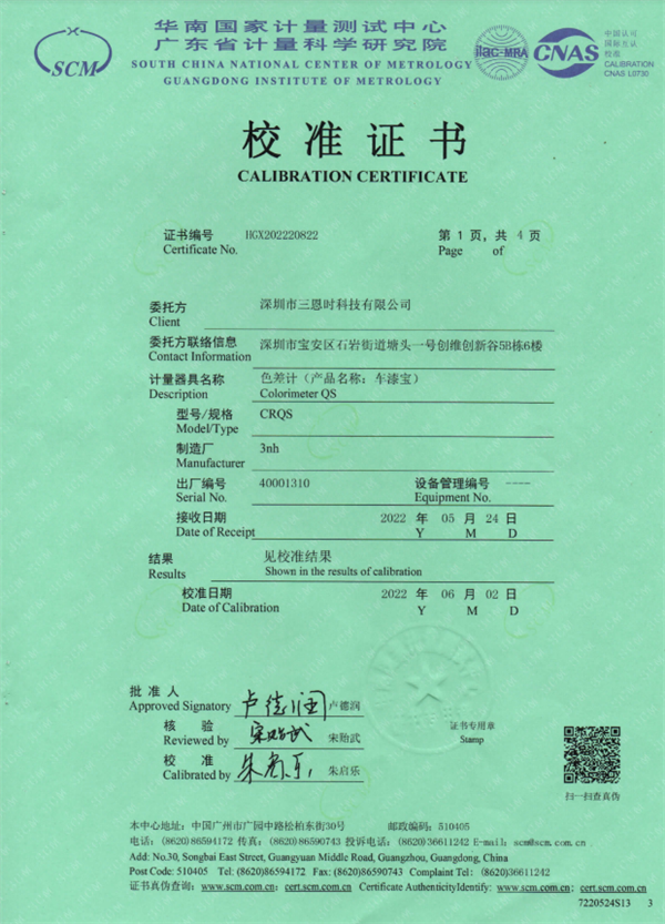 車漆寶CRQS校準(zhǔn)證書如下: