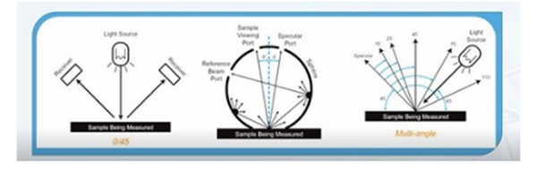 色差儀常用的有三種幾何結(jié)構(gòu),包括0°/45°,d/8°和多角度,其中d/8°還有包含鏡面反射狀態(tài)和排除鏡面反射狀態(tài)。同一個(gè)樣品使用不同的幾何結(jié)構(gòu)的分光光度儀測量得到的結(jié)果是不同的。為了達(dá)到與目測結(jié)果一致,建議按照如下原則選擇儀器和設(shè)置: