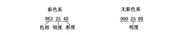 對于彩色系的滌綸繡花線,顏色的標號由7位數(shù)字組成,前3位數(shù)字表示對應的色相,第4、5位數(shù)字表示對應的明度,后2位數(shù)字表示對應的彩度。