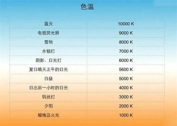 色溫的單位是開爾文(K)。不同的光源具有不同的色溫值,例如,日光在中午時的色溫大約為5500K,而蠟燭的火光則大約為1800K。這些色溫值為我們提供了衡量光源顏色的標(biāo)準(zhǔn)。
