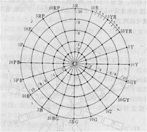 顏色的色調(diào)H用圍繞孟塞爾立體中央軸的角位置來(lái)代表。孟塞爾立體水平剖面上以中心軸為中心,將圓周分為相等的10個(gè)部分(如圖5-33),五個(gè)主要色調(diào)紅(R)、黃(Y)、綠(G)、藍(lán)(B)、紫(P)和五個(gè)中間色調(diào)黃紅(YR)、綠黃(GY)、藍(lán)綠(BG)、紫藍(lán)(PB)、紅紫(RP)。每一種色調(diào)再細(xì)分成10等級(jí),從1到10,并規(guī)定每種主要色調(diào)和中間色調(diào)的標(biāo)號(hào)為5。孟塞爾色調(diào)有100種。在《孟