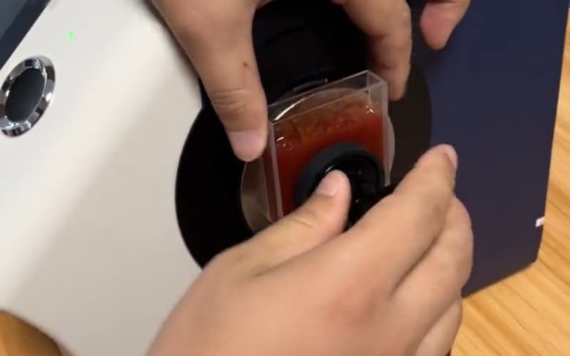 第三步:將待測樣品(番茄醬)倒入比色皿中并放到儀器測量口上