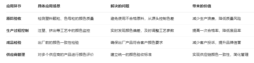 三恩時塑膠色差儀在塑料行業(yè)產(chǎn)業(yè)鏈各環(huán)節(jié)都發(fā)揮著重要作用,其具體應(yīng)用價值如下表所示:
