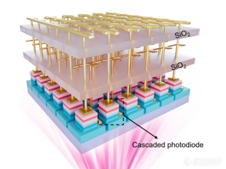 孫海定團(tuán)隊(duì)聯(lián)合國內(nèi)外學(xué)者提出了一種氮化鎵基級聯(lián)光電二極管架構(gòu),研制出工作于紫外波段的微型光譜成像儀,實(shí)現(xiàn)了高精度光譜探測與高分辨率多光譜成像。該結(jié)構(gòu)由上下兩個(gè)不對稱p-n二極管垂直級聯(lián)組成,可在兩英寸和更大尺寸的晶圓上陣列化制備。器件實(shí)現(xiàn)電壓可調(diào)的雙向光譜響應(yīng),結(jié)合深度神經(jīng)網(wǎng)絡(luò)算法,可對未知光譜進(jìn)行高精度重構(gòu)。該光譜成像儀工作波段覆蓋250至365納米的紫外波段,光譜分辨率可達(dá)0.62納米,響應(yīng)速度約10納秒。