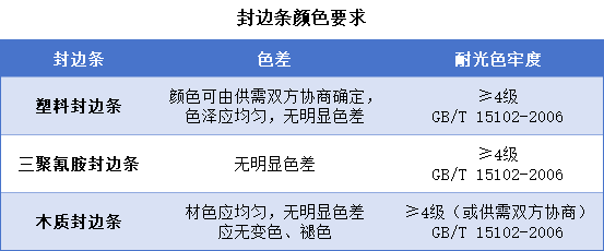 該標(biāo)準(zhǔn)規(guī)范了家具用封邊條的顏色等要求,其中,塑料封邊條,三聚氰胺封邊條和木質(zhì)封邊條均要求無明顯色差,色差和色牢度具體要求如下: