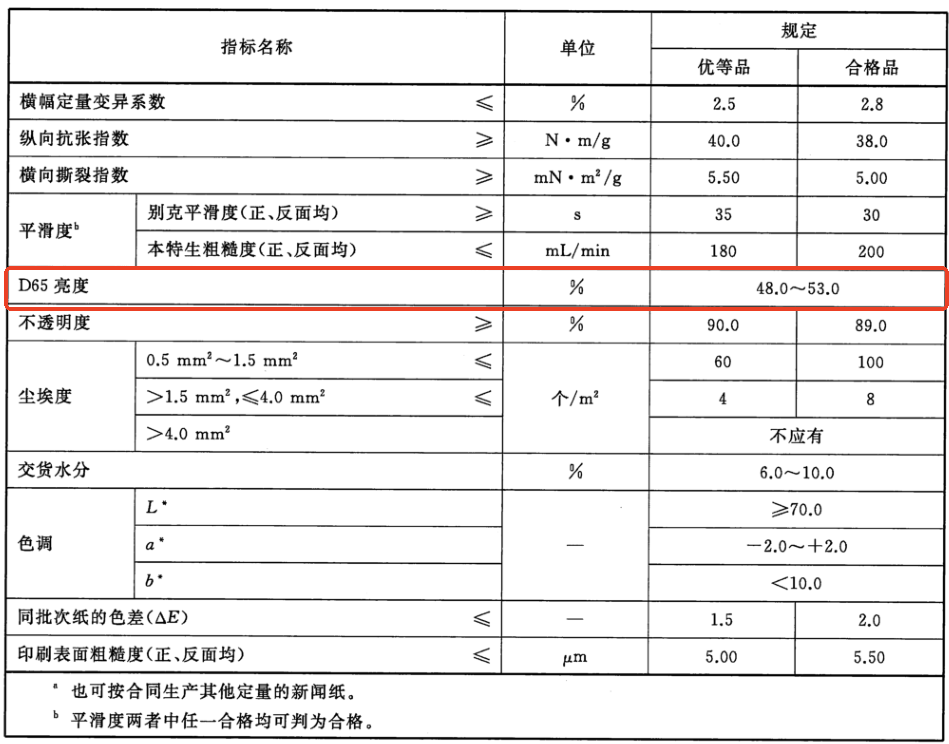 這一標(biāo)準(zhǔn)明確規(guī)定了新聞紙的D65亮度(即白度)范圍。D65亮度是指在D65光源模擬日光條件下,紙張對457nm藍光的漫反射因數(shù)測量值。在日常生活中,我們簡單稱之為“白度”。