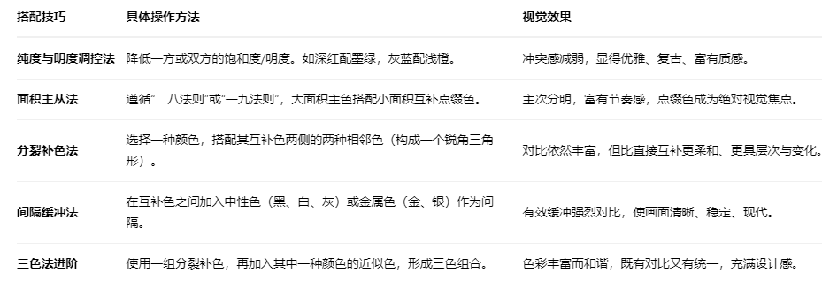 直接使用高純度的互補(bǔ)色,雖能瞬間吸引眼球,但也極易造成視覺疲勞和廉價(jià)感。高級(jí)的搭配在于控制與調(diào)和。