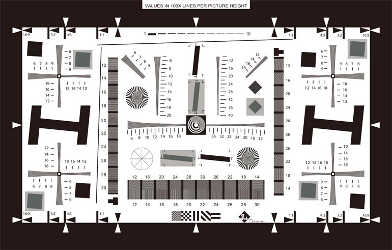 隨著時代的進步 ISO12233 也必須跟著改變,方能跟上日新月異的器材表現(xiàn)。新版解像力測試圖(上圖)已經(jīng)推出,這張名為 Digital CINE Camera Resolution Chart 同樣是根植于 ISO12233 標(biāo)準(zhǔn)而建立。除了保有原來的測試標(biāo)準(zhǔn)外,也針對未來數(shù)字影像器材的發(fā)展,擴大展圖比例,同時也囊括了更高解析度的判讀元素 (針對千萬畫素以上 DSLR),CINE 圖展達 60 cm x 144cm。
