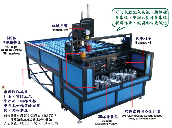 人性化母液管理功能自動精準記錄染料剩余量,可知優(yōu)先泡藥順序,并有染液過期提醒功能,便于管理。模組化設(shè)計本機的機械手,轉(zhuǎn)盤,天平,敲打盒皆為可關(guān)閉的獨立模組,可在關(guān)閉模組的情況下,繼續(xù)完成計量作業(yè)