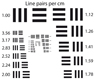 Line pairs per cm (1-28.5 LP/cm, set of 10 pcs.) The TE138 is designed to do resolution measurements. Pairs of lines with frequencies from 1-28.5 linepairs per centimeter are printed on a white background. The patterns are ordered clockwise in decreasing resolution on the chart. |