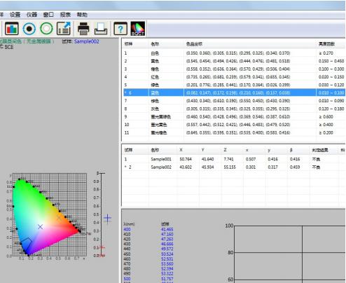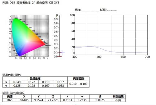 譬如如何判定藍(lán)色試樣是否在《GB/T 18833-2012道路交通反光膜樣》所規(guī)定的藍(lán)色區(qū)域內(nèi)(無金屬鍍層,晝間反光膜顏色),按照下面的步驟,將依次完成測(cè)量和判定。