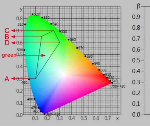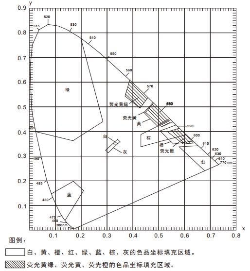 在《GB 2893安全色》、《GB/T 18833道路交通反光膜》等相關(guān)標(biāo)準(zhǔn)中,通常給出一塊顏色區(qū)域(多個(gè)色品坐標(biāo)點(diǎn))和亮度因數(shù)要求,在D65/A光源和45/0幾何條件下,判定樣品是否落在對(duì)應(yīng)的顏色區(qū)域內(nèi),借此判定樣品是否滿足標(biāo)準(zhǔn)規(guī)定的色度要求。由于顏色區(qū)域?yàn)槎噙呅?,如下圖所示,導(dǎo)致使用普通的分光測(cè)色儀無法完成判定。NS808測(cè)色儀配合SQCT軟件的交通路標(biāo)測(cè)量模塊則可以輕松解決這方面的問題。