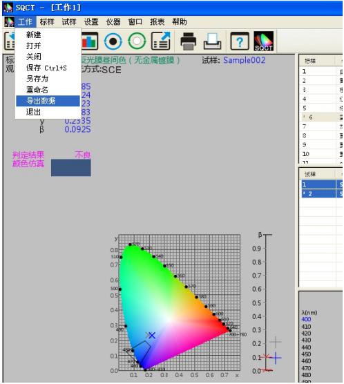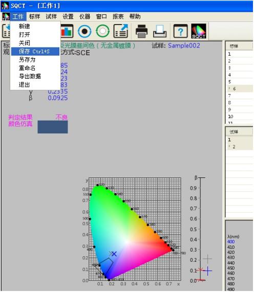 將測(cè)試樣品放在NS808測(cè)量口徑上,貼緊,鼠標(biāo)點(diǎn)擊試樣測(cè)試快捷工具,如圖13所示。大約1.5秒時(shí)間,完成測(cè)試,測(cè)試數(shù)據(jù)如圖13中S5所示,在色品坐圖中的位置如S7所示,仿真及判定結(jié)果如S6部分所示。