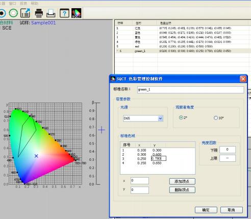 如圖7所示,修改上面建立的名稱為“green”的多邊形-容差標(biāo)樣,先選中該標(biāo)準(zhǔn),然后可以修改“標(biāo)準(zhǔn)名稱”“光源”“標(biāo)準(zhǔn)觀察者角度”“亮度因數(shù)“色品坐標(biāo)”,修改完畢,點(diǎn)擊“確定”按鈕,則修改生效。