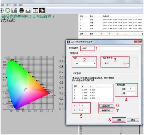 如圖5所示,在位置1處輸入標(biāo)樣名稱,位置2處選擇光源種類(默認(rèn)為D65),位置3處選擇觀察者角度(默認(rèn)為2度),位置4處輸入亮度因數(shù)(除熒光物質(zhì)外,普通反射樣品亮度因數(shù)大于0小于1,即0<β<1)。在位置5處輸入色品坐標(biāo)點(diǎn),然后點(diǎn)擊“添加頂點(diǎn)”按鈕,則新輸入的色品坐標(biāo)點(diǎn)出現(xiàn)在標(biāo)準(zhǔn)色域框內(nèi),重復(fù)上述步驟,依次輸入各色品坐標(biāo)點(diǎn);對(duì)于輸入錯(cuò)誤的色品坐標(biāo)點(diǎn),先在標(biāo)準(zhǔn)色域框內(nèi)選中,然后點(diǎn)擊“刪除頂點(diǎn)”按鈕,則刪掉該頂點(diǎn)。全部輸入完畢,點(diǎn)擊位置8處“添加”按鈕,則完成“多邊形-容差標(biāo)樣”建立。