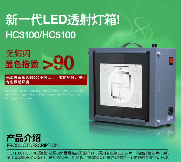 標(biāo)準(zhǔn)透射燈箱HC5100/3100是3nh研發(fā)的新款透射燈箱,采用專業(yè)級(jí)LED芯片,精確計(jì)算芯片排列,使用直流電驅(qū)動(dòng)無(wú)頻閃,使用壽命長(zhǎng),為影視、攝像鏡頭評(píng)價(jià)體系提供一個(gè)更好的專業(yè)照明環(huán)境。