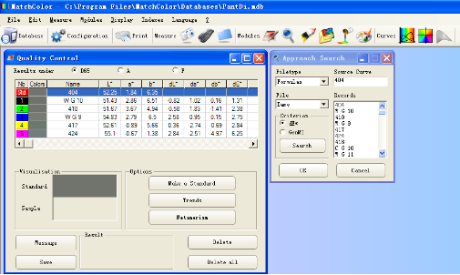 如果在色庫中已經(jīng)存儲了許多過去曾經(jīng)做過的顏色,使用這個功能,系統(tǒng)就能在色庫中尋找同標(biāo)準(zhǔn)色接近的顏色,并且把尋找到的顏色按照色差值由小到大進行排列,顯示出來。