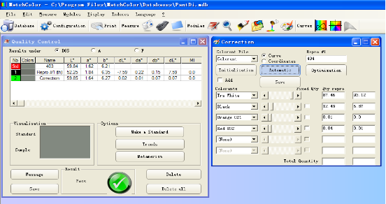 首先選擇正確的色料數(shù)據(jù)庫,然后點擊計算按鈕。這時軟件就會自動地對色料數(shù)據(jù)庫中的色料進行組合,計算出各種可能的配方,然后把更好的20個配方按照色差由小到大的順序顯示出來。