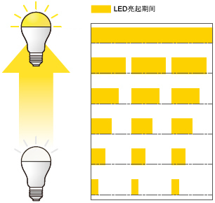 PWM 是" 脈沖寬度調(diào)制" 的縮寫," 脈沖寬度調(diào)制" 是一種通過控制脈沖信號(hào)ON 期間和OFF 期間的比率來控制信號(hào)強(qiáng)度的方法。脈沖信號(hào)是一種在ON 和OFF 之間反復(fù)交替的信號(hào),ON期間在一個(gè)周期中的百分比被稱為" 占空比"。PWM 控制照明是一種通過控制來自脈沖發(fā)射源光占空比(發(fā)光時(shí)間)來控制燈亮度的方法。 發(fā)光時(shí)間越長(zhǎng),光就會(huì)變得越亮;反過來,發(fā)光時(shí)間越短,光就會(huì)變得越暗。