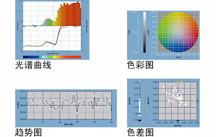 | 圖表顯示 | 光譜反射比(能見度)及其色差,K/S及其色差,吸收率及其色差,L*a*b*絕對值,L*a*b*(2D/3D色差分布,MI),xy色度圖,每個色空間的趨勢圖和柱狀圖以及色差方程式 |